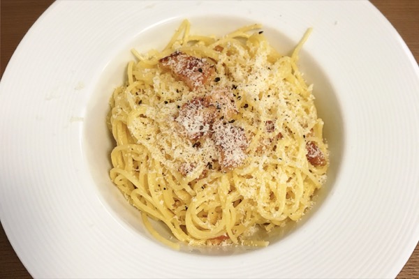For a long time I thought I didn’t like carbonara because the few I tried were too creamy and eggy. Recently I gave it another try because the picture in the menu looked delicious. It was excellent, and I decided I wanted to learn how to make it myself. I needed some practice before I felt comfortable with the timings, but overall it’s a pretty simple recipe that wasn’t hard to learn.